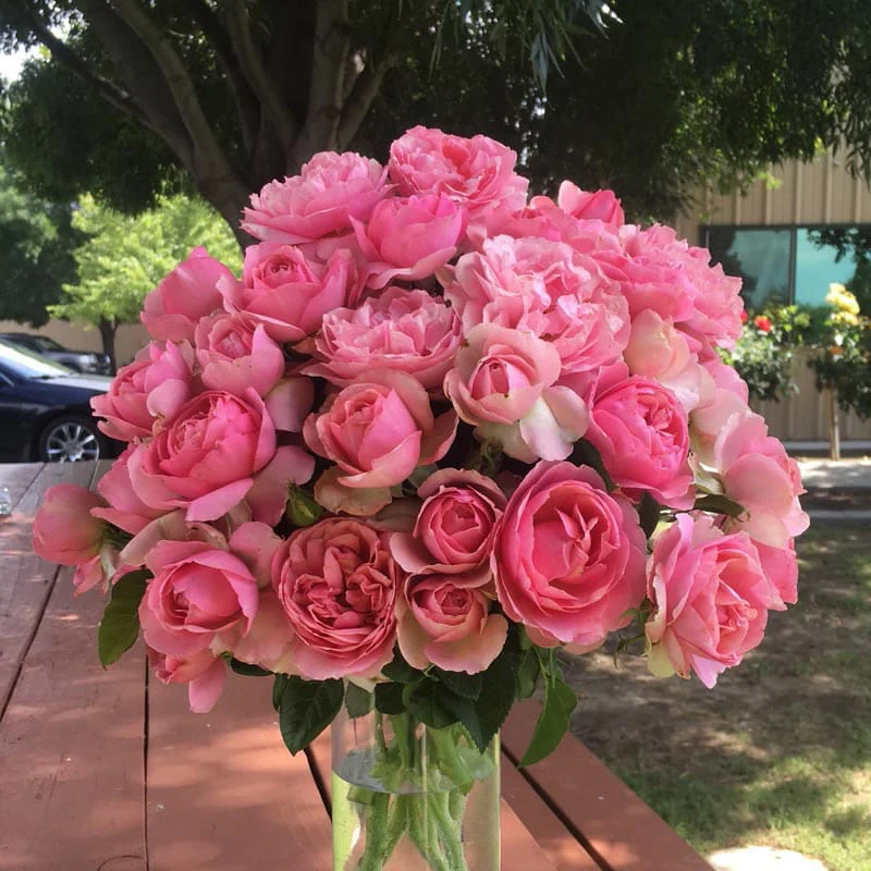 A real asset to the garden, All Dressed Up™ delivers everything you could want in a rose. Big, soft pink blooms reliably bear 35+ petals each for a very full appearance, and they appear in abundance throughout the long growing season. Old-fashioned in form, this English-type variety features clean, mid green foliage, an upright, well-branched growth habit and high-centered flowers that are perfect for fresh arrangements. They also have a uniquely crisp, green apple fragrance that makes visiting the garden a real treat. Plus, this wonderful rose has something most Grandifloras cannot boast—excellent resistance to the diseases that often plague roses. Growing at a moderate rate once established, All Dressed Up reaches a height of up to 5' tall with a 4' spread. Planted in groups, they make a fantastic display, and would be perfect for a hedge. Drought tolerant. Attracts beneficial pollinators to the landscape. Bred by Christian Bedard. Rosa WEKgrasucejuc PPAF