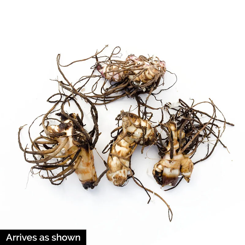 Set your garden apart from the rest with the addition of this striking tropical offering. Phasion Variegated Canna is a gorgeous variety that boasts some of the most spectacular foliage around. Broad, ovate leaves are striated in bold shades of red, yellow and pink—a real standout in the landscape. Beginning in midsummer, the large, bright orange canna lily flowers appear in clusters atop very tall, very strong stems. The phasion variegated canna lily flowers have a flared form that give an island-inspired look to borders and decorative containers. This fast-growing rhizome is easy to grow, tolerant of many soil types and deer resistant. Butterflies love it. The phasion variegated canna is a sun-loving perennial and the perfect border plant to bring color to your garden. Canna x generalis 'Phasion'