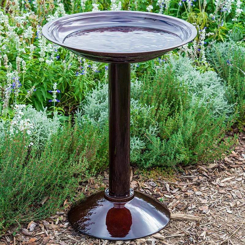 With elegant lines, this functional birdbath makes the perfect addition to any flower bed, patio or bird feeding area. Together with our Floating Solar Fountain—which will stir up the water to attract birds and keep away insects—it is a delightful, no-fuss water feature. Simplicity Birdbath's enameled construction is completely durable, while its dark, copper-coated burgundy color hydrates the birds in style. A 17" wide, stepped iron basin offers easy water access and plenty of space for birds to share. No other birdbath on the market provides such a clean design at such an affordable price. Tool-free assembly required. The included Floating Solar Fountain is a beautiful and useful addition that doesn't require any extra assembly—simply place it in the bath. Both the fountain feature and the solar panel are in the round base, so there are no wires or external batteries. Water flow is dependent on the strength of the sun; starting after 3 seconds of direct sun, water will begin leaping 4-5 inches high to provide plenty of movement, but not so much it splashes out of the basin. It even works on overcast days, though it pulses rather than providing a steady stream. Fountain: 6 ¾ diameter; Birdbath: H22½"xW17"xD2¾"(at center).